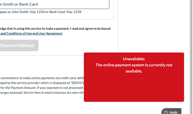 The cart may be disabled by an office for a multitude of reasons. An office may disable the cart due to a tax sale, or prior to the beginning of a tax collection season while they are waiting on finalized tax data. During this brief pause, a payer will not be able to add a Stored Payment Method or subscribe to an Automated Payment and may encounter an error message.
