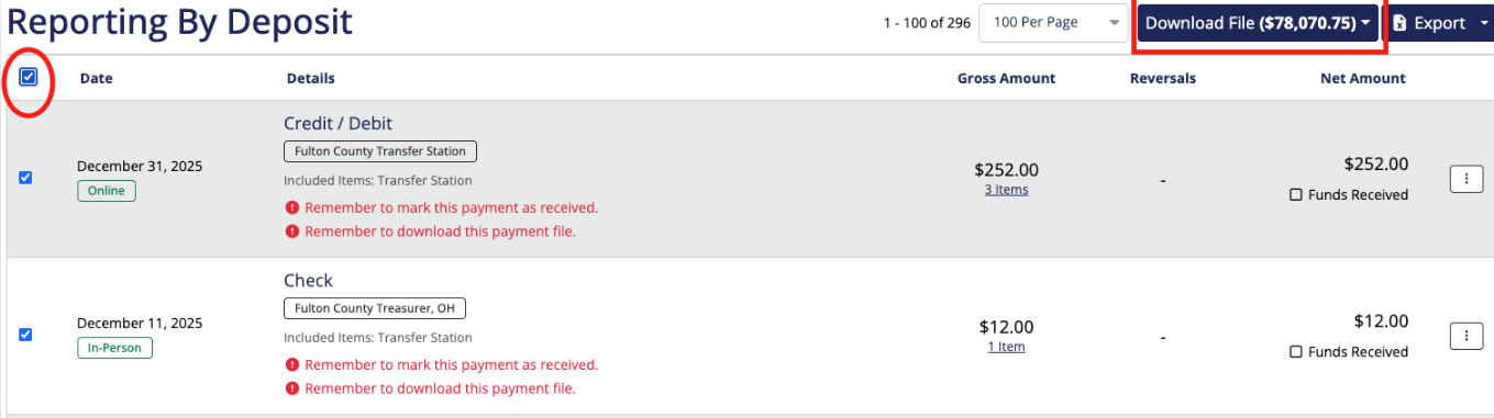 To download multiple deposits for a single payment file, check the boxes to the left of each deposit, and click the **Download File** button.